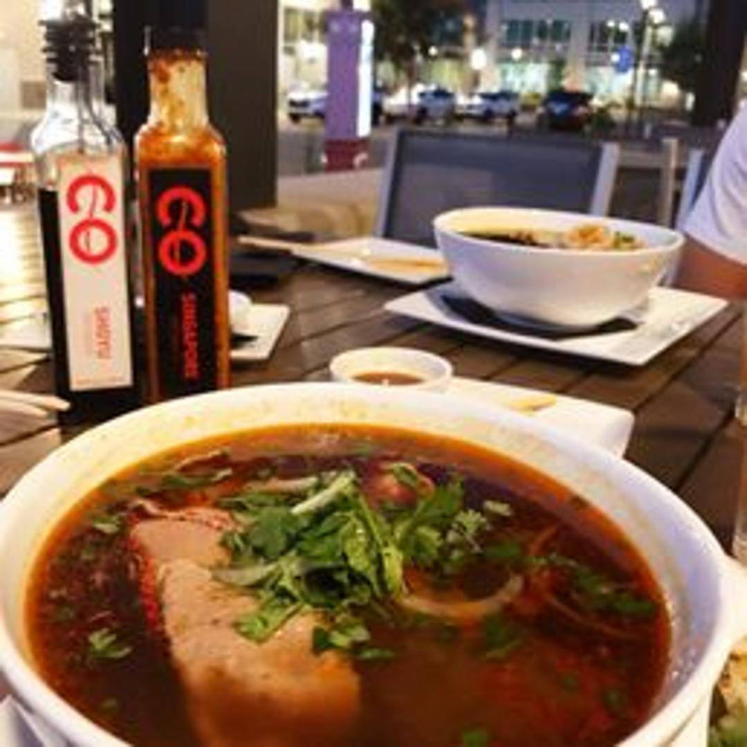 A vibrant and aromatic Vietnamese noodle soup featuring tender slices of slow-cooked beef, fresh rice noodles, and a rich, spicy beef broth infused with traditional herbs and spices. Garnished with fresh herbs, crisp bean sprouts, and a wedge of lime, offering a warming and robust flavor experience with a fiery kick.