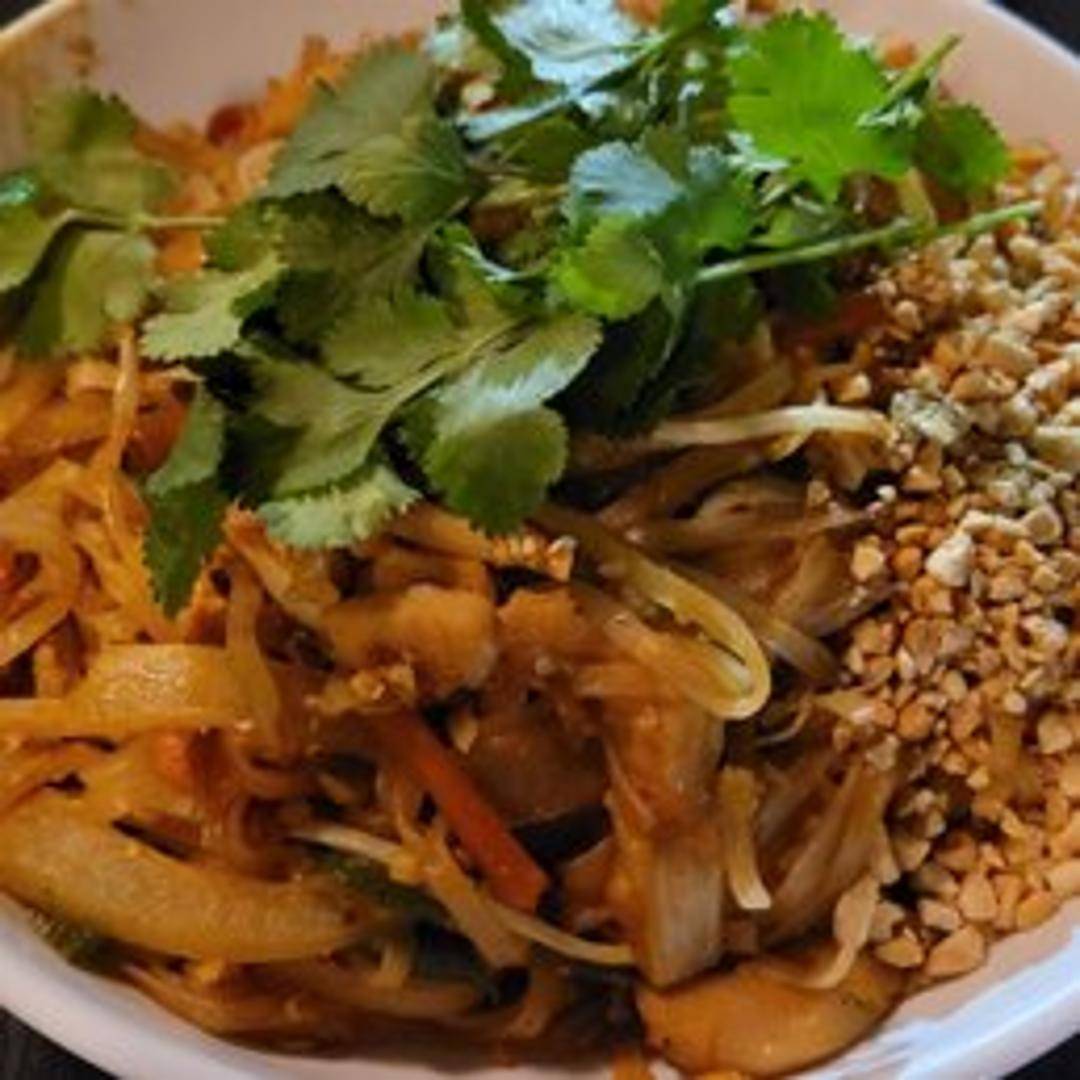 Discover the iconic taste of Thailand with our authentic Pad Thai. This beloved stir-fried noodle dish features delicate rice noodles wok-tossed with your choice of protein, eggs, tofu, and a medley of fresh vegetables. It's perfectly balanced with a signature sweet, sour, and savory sauce, then garnished with crunchy peanuts, fresh bean sprouts, and a lime wedge for a burst of zesty freshness.