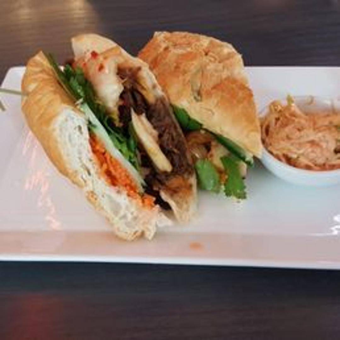 A celebrated Vietnamese street food staple, our Banh Mi is a harmonious blend of textures and flavors. It features a crispy on the outside, soft on the inside baguette, generously filled with savory marinated meats (such as grilled pork or chicken), accompanied by refreshing pickled carrots and daikon, fresh cilantro, sliced chilies, and a smear of rich pâté or creamy mayonnaise for an authentic taste.