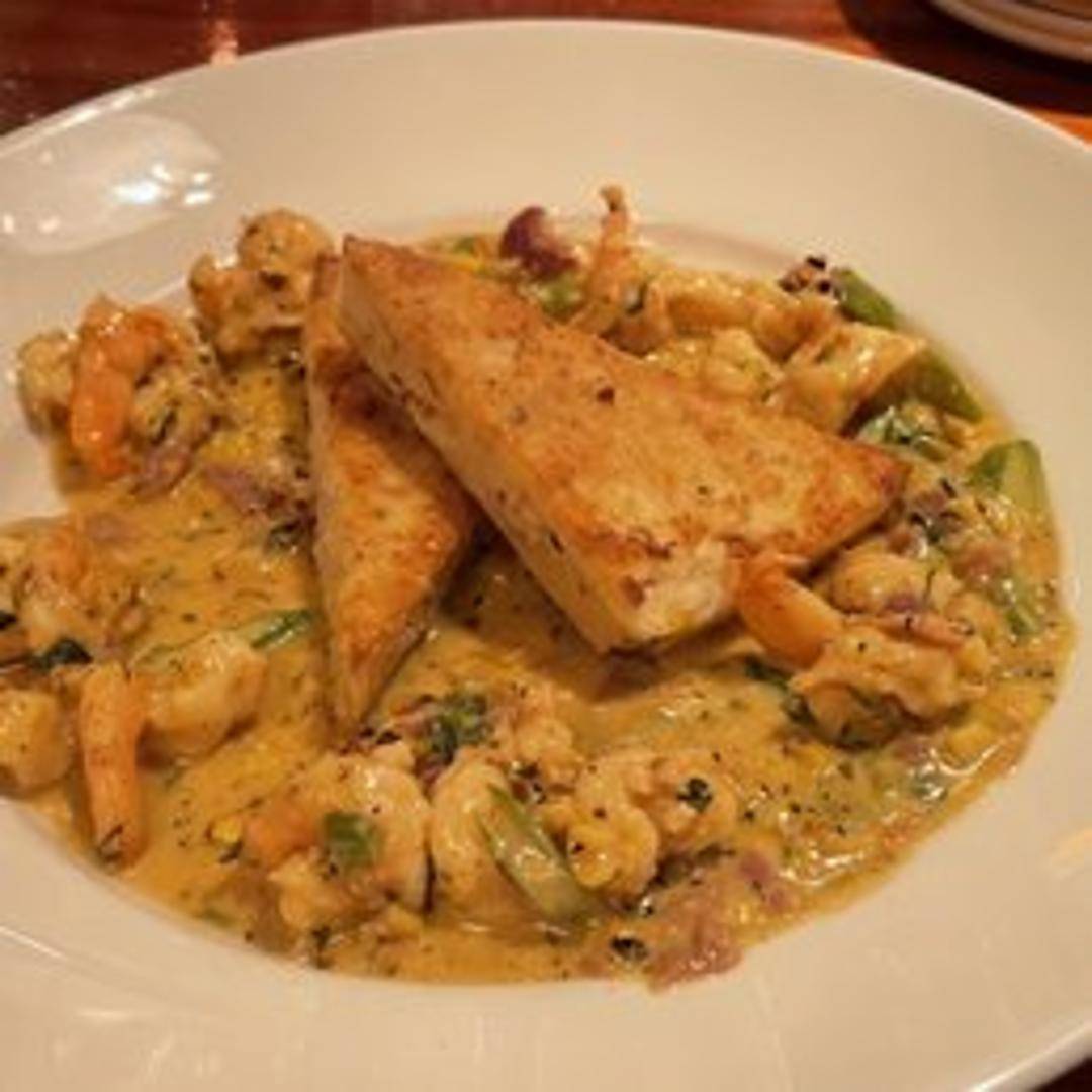 Indulge in a refined take on a classic, featuring succulent, perfectly sautéed shrimp complemented by a single, exquisitely prepared creamy grit cake. This dish offers a delightful balance of fresh, tender seafood and a comforting, golden-fried texture.