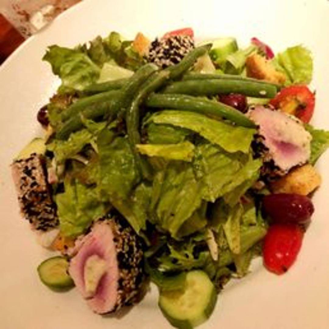 A vibrant salad featuring a fresh cut of tuna, perfectly grilled and encrusted with toasted sesame seeds, served atop a bed of crisp greens and complementary fresh vegetables, dressed with a light, flavorful vinaigrette.