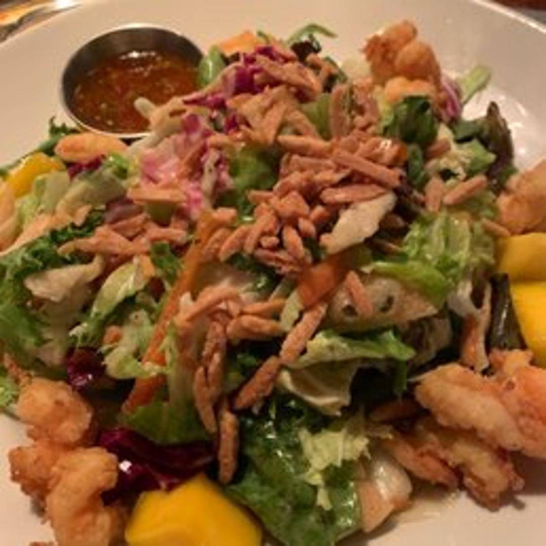An innovative salad creation featuring tender, crispy-fried shrimp combined with two distinct types of noodles, offering a delightful textural contrast. This refreshing dish is served with fresh greens and a zesty, light dressing.