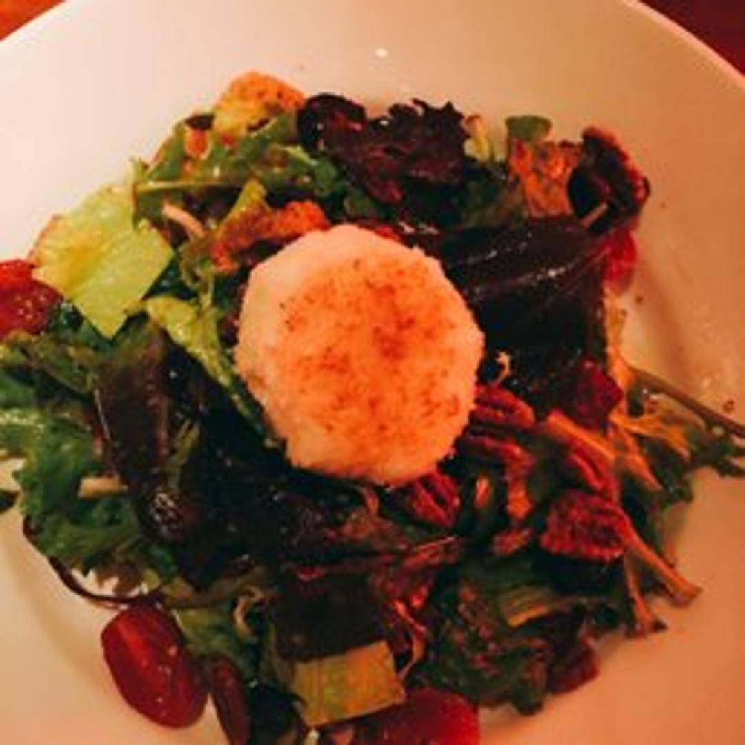 A sophisticated salad combining creamy, tangy warm goat cheese with the delightful crunch of spiced pecans, served over a bed of fresh mixed greens and drizzled with a balanced vinaigrette, offering a delightful interplay of textures and flavors.