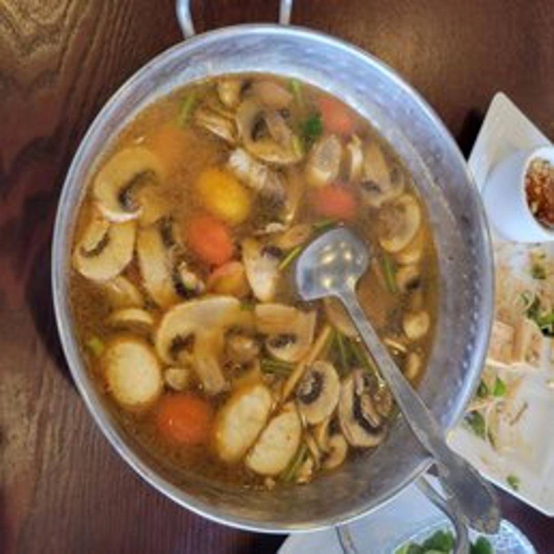 A hot and sour Thai soup with lemongrass, galangal, kaffir lime leaves, chilies, mushrooms, tomatoes, and your choice of protein. A flavorful and aromatic broth with a tangy kick.
