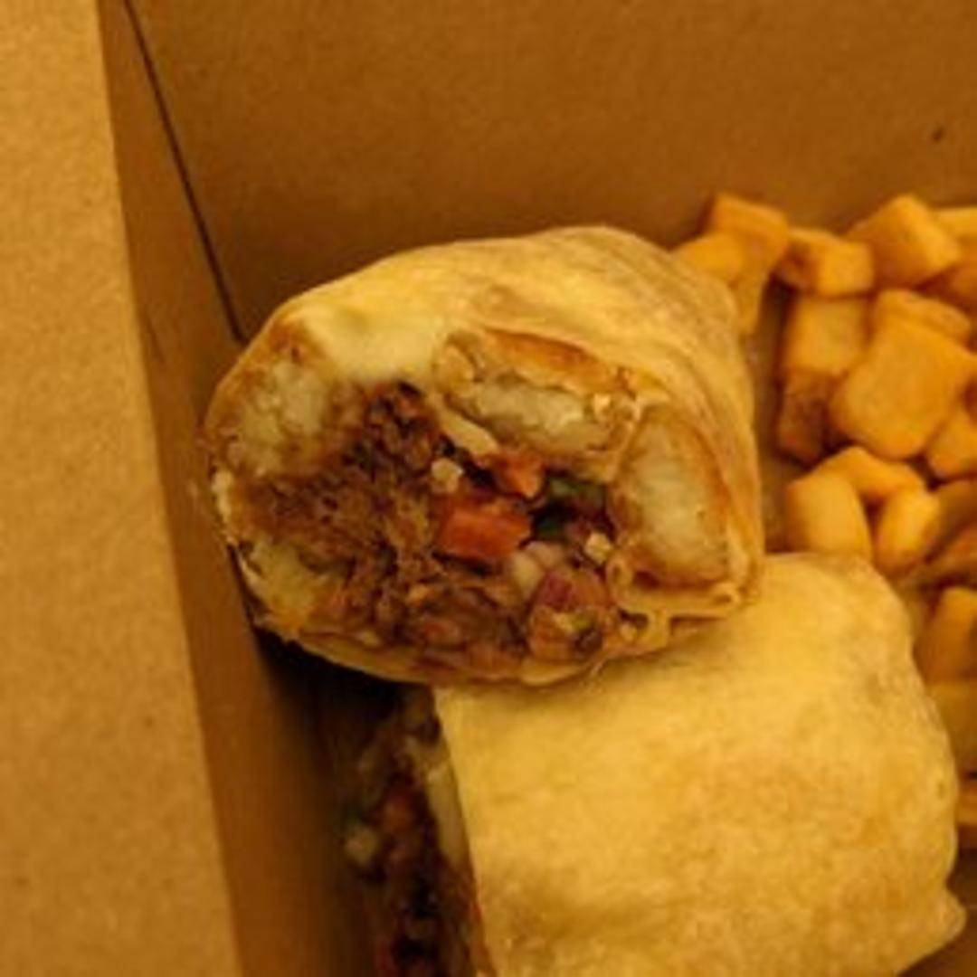 Scrambled eggs, cheddar cheese, crispy potatoes, and your choice of bacon or sausage, wrapped in a warm flour tortilla. Served with a side of salsa.
