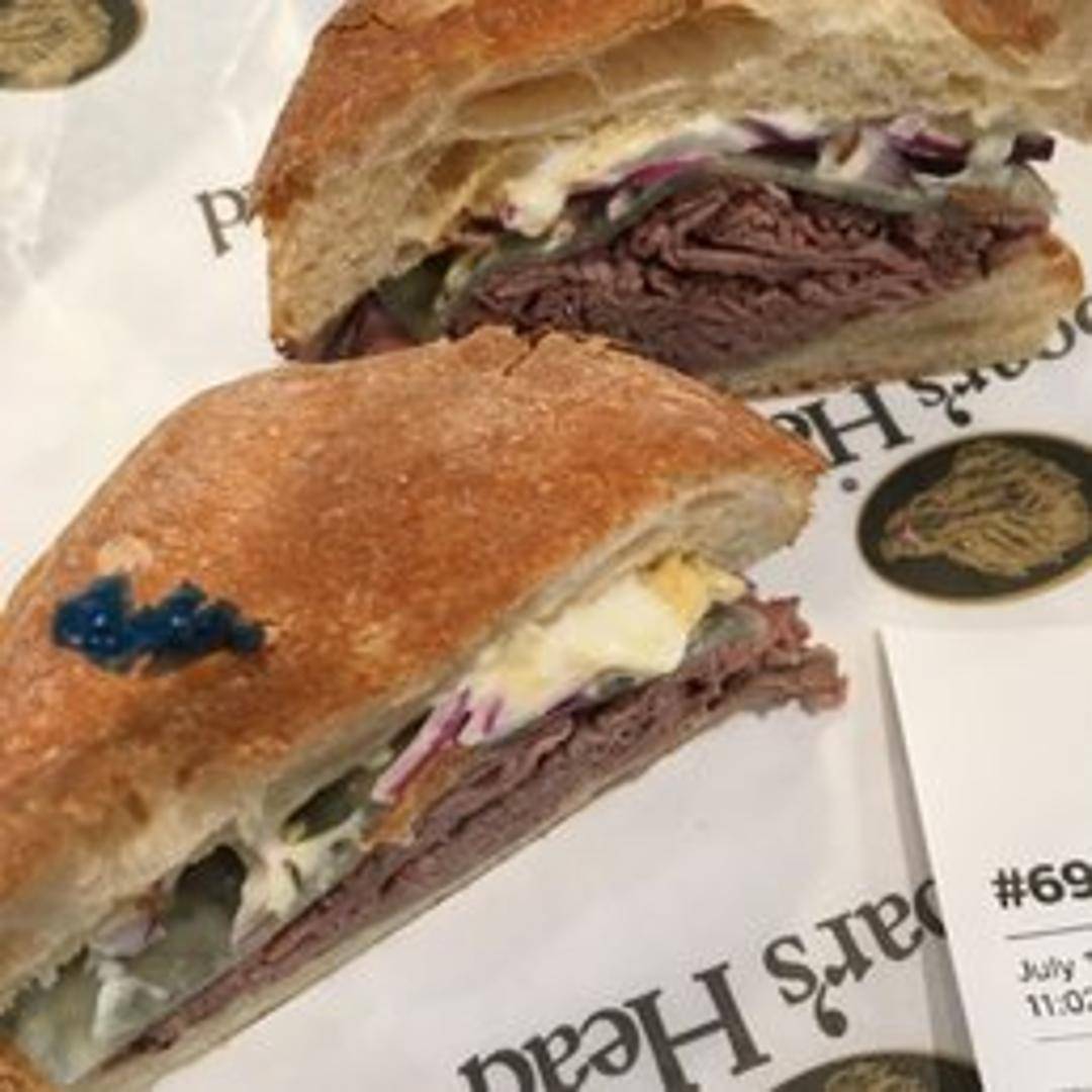 A robust sandwich piled high with tender roast beef, crumbled blue cheese, caramelized onions, and a horseradish aioli on a toasted ciabatta roll.