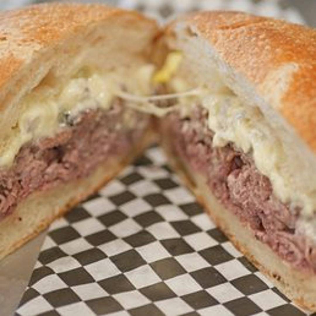 Grilled and thinly sliced London broil steak served on a toasted baguette with caramelized onions, sauteed mushrooms, and a garlic aioli.
