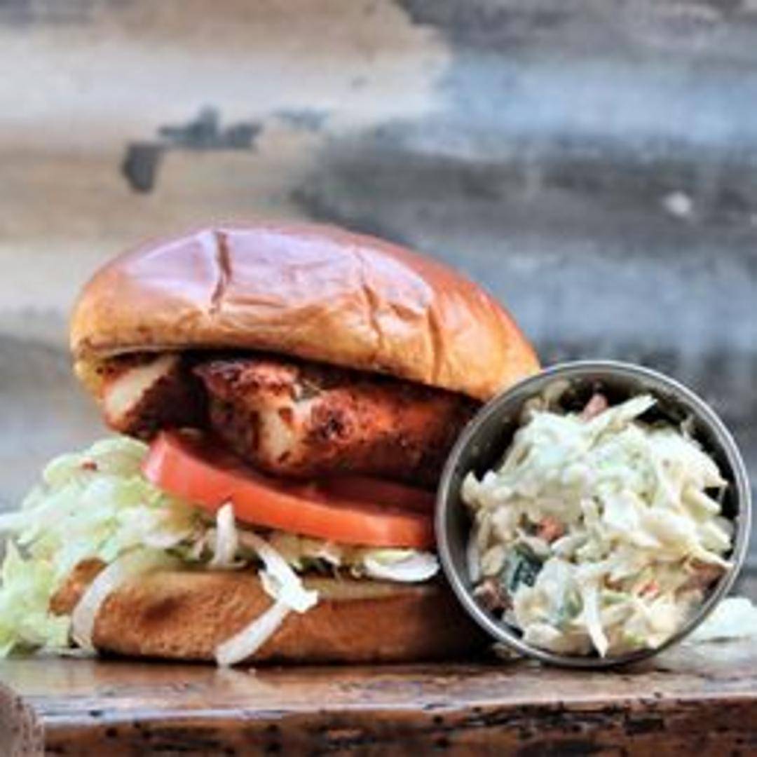 Blackened white fish, house-made tartar sauce, shredded lettuce, tomato, and red onion on a toasted brioche bun.