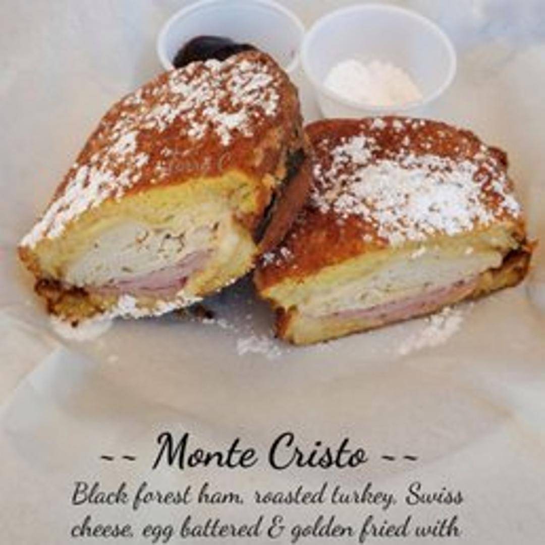 A classic sandwich featuring sliced ham, turkey, and Swiss cheese, dipped in an egg batter and pan-fried to a golden brown. Lightly dusted with powdered sugar and served with a side of jam.