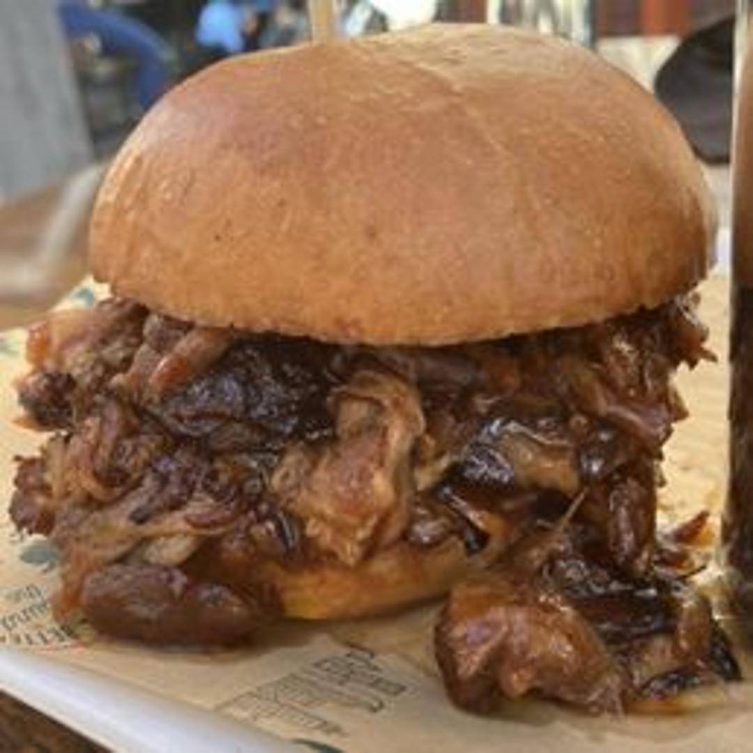 Tender pulled pork smothered in BBQ sauce, served on a soft bun, often with coleslaw.