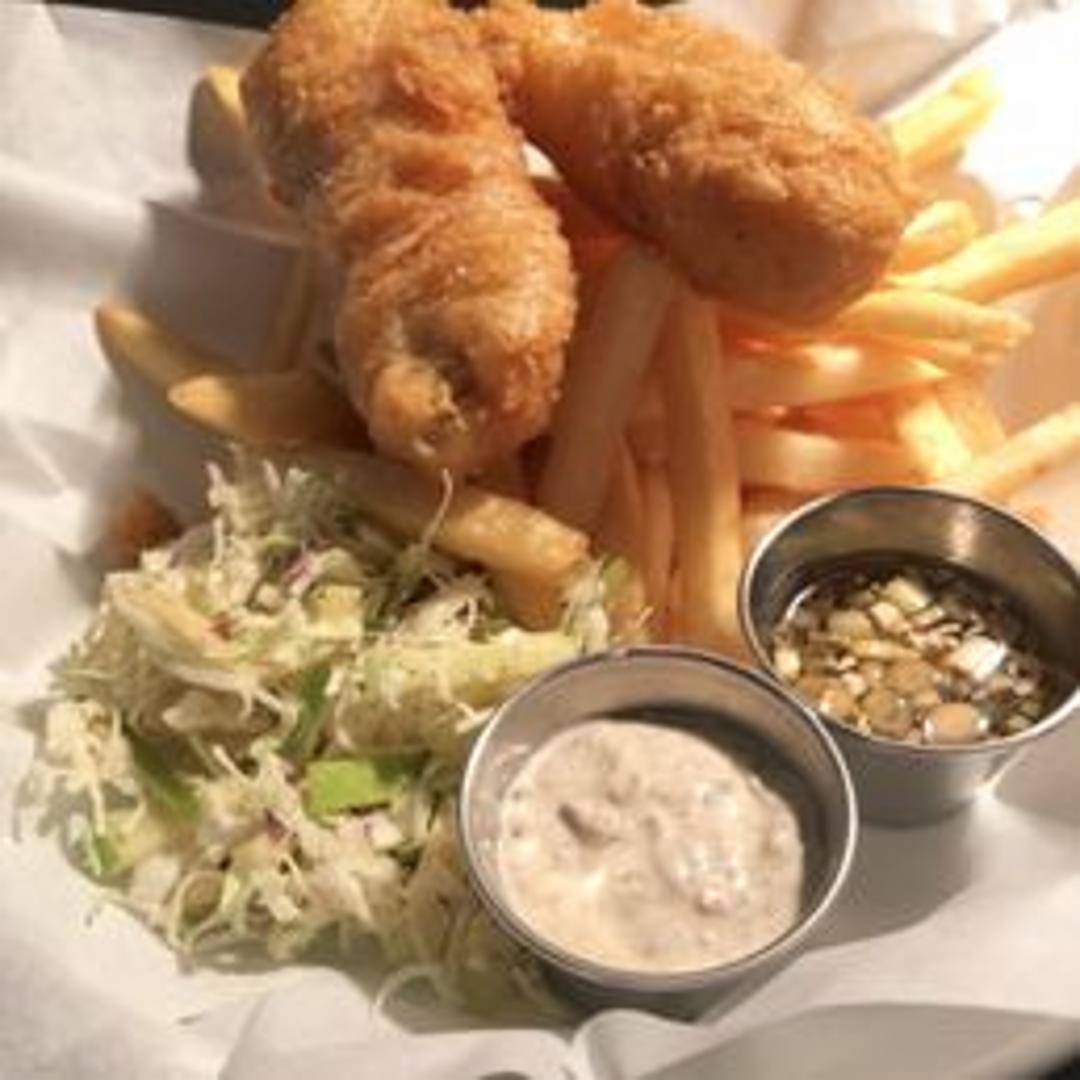 Beer-battered cod fillets served with crispy fries, tartar sauce, and lemon wedges.