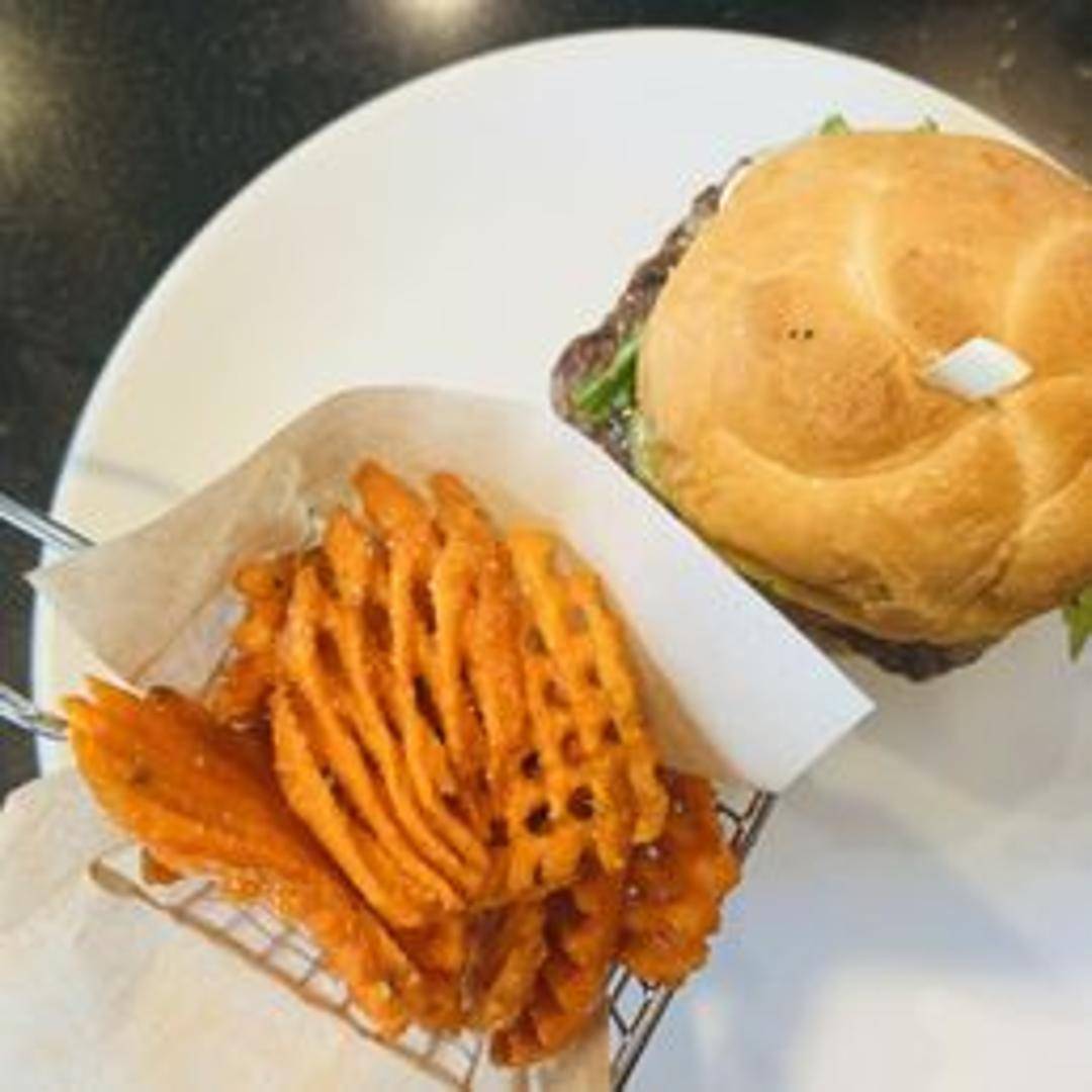 A lean and flavorful bison patty topped with cheddar cheese, bacon jam, lettuce, and tomato on a toasted brioche bun.