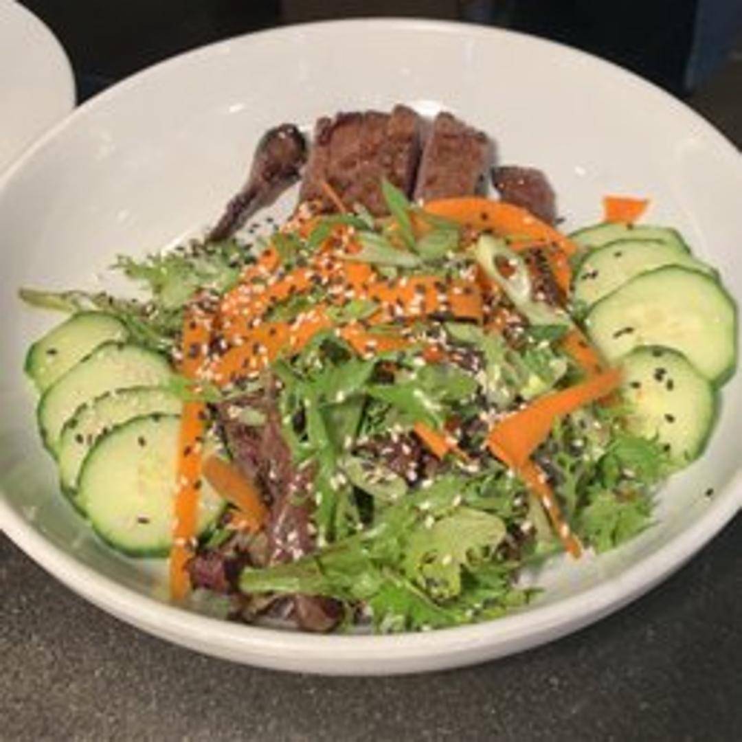 Grilled steak sliced and served over mixed greens with tomatoes, cucumbers, red onions, and your choice of dressing.