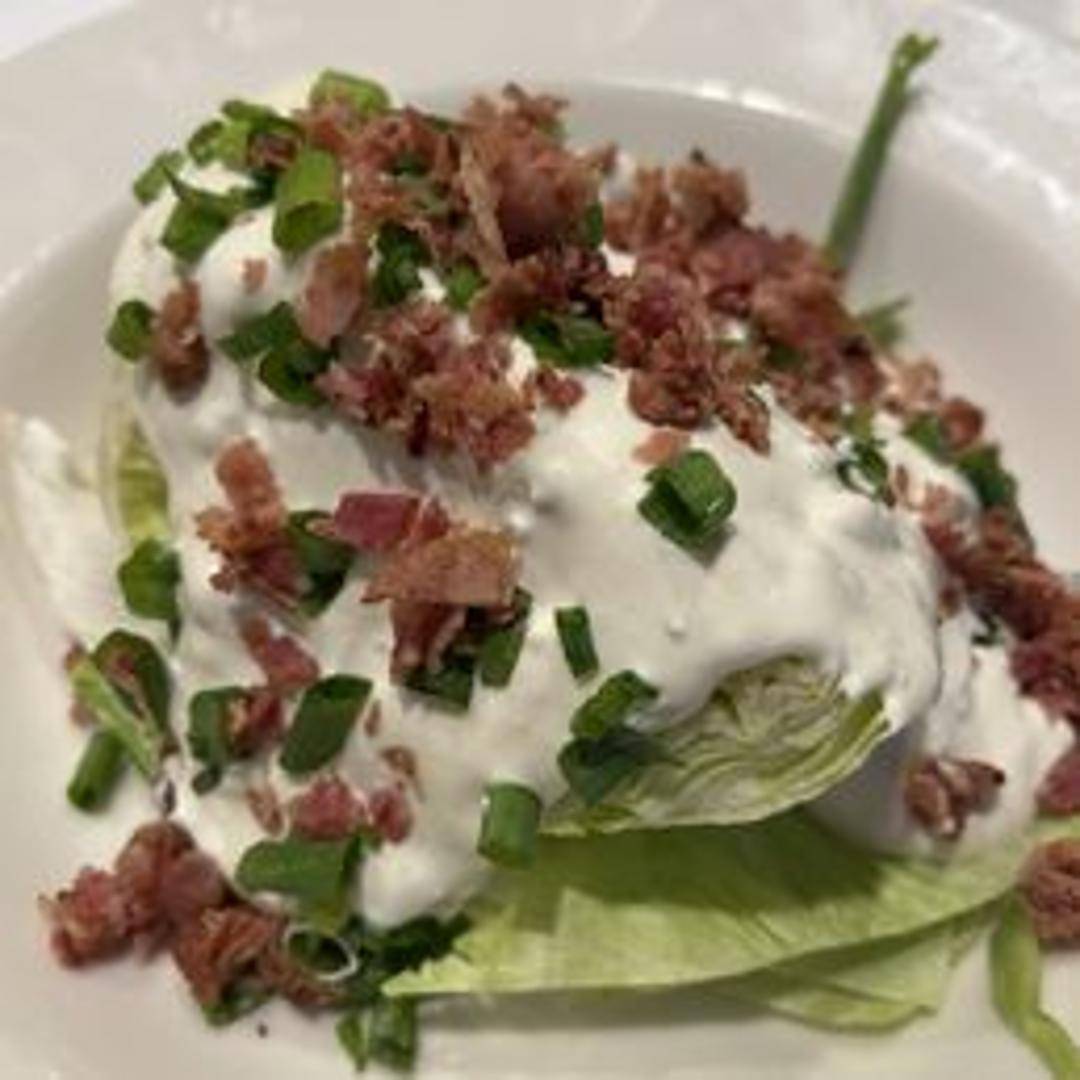 A crisp wedge of iceberg lettuce topped with bleu cheese dressing, crumbled bacon, and diced tomatoes.