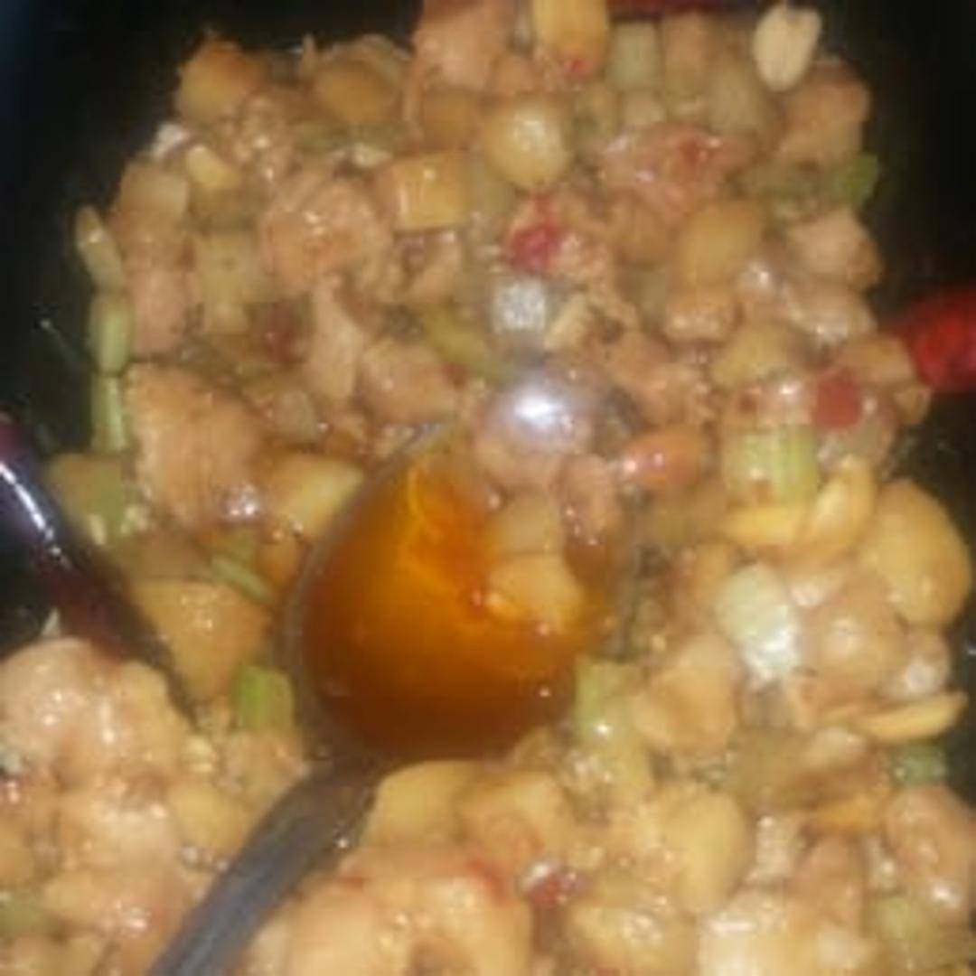 Diced chicken stir-fried with peanuts, vegetables, and dried chili peppers in a spicy and savory Kung Pao sauce.