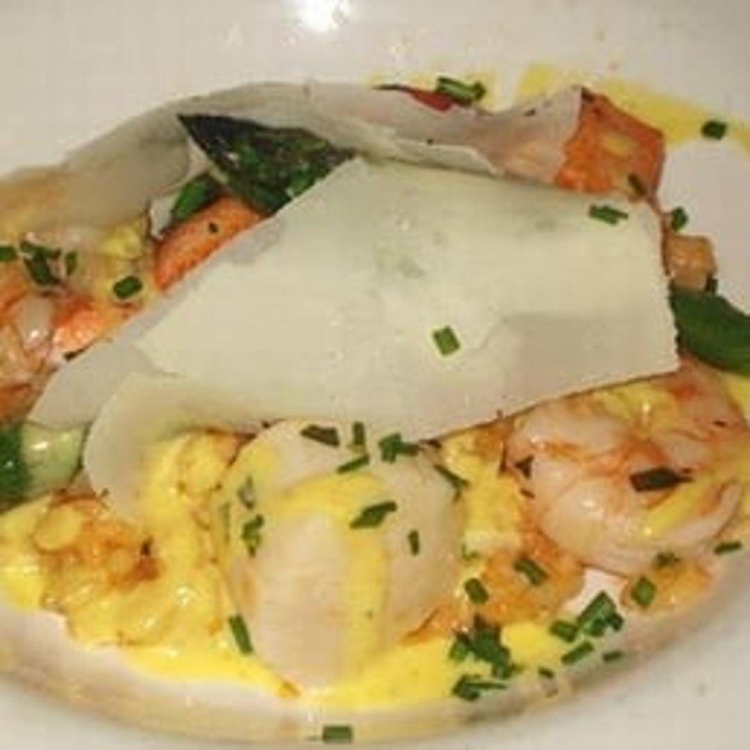 Creamy risotto infused with seafood broth and topped with a variety of fresh seafood, such as shrimp, scallops, and mussels. Garnished with fresh herbs.