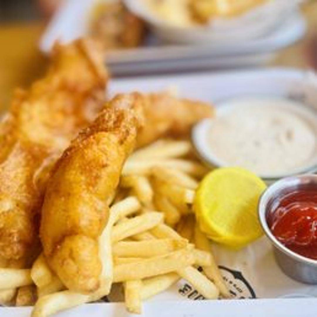 Crispy, golden-battered fresh fish served with thick-cut chips (fries). Accompanied by tartar sauce and lemon.