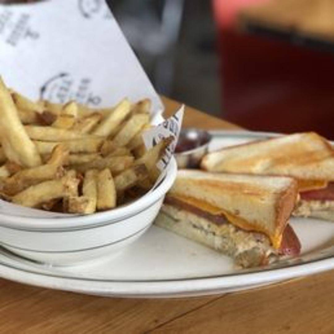 Albacore tuna salad with melted cheddar cheese on grilled sourdough bread. Served with a side of coleslaw and house-made pickles.
