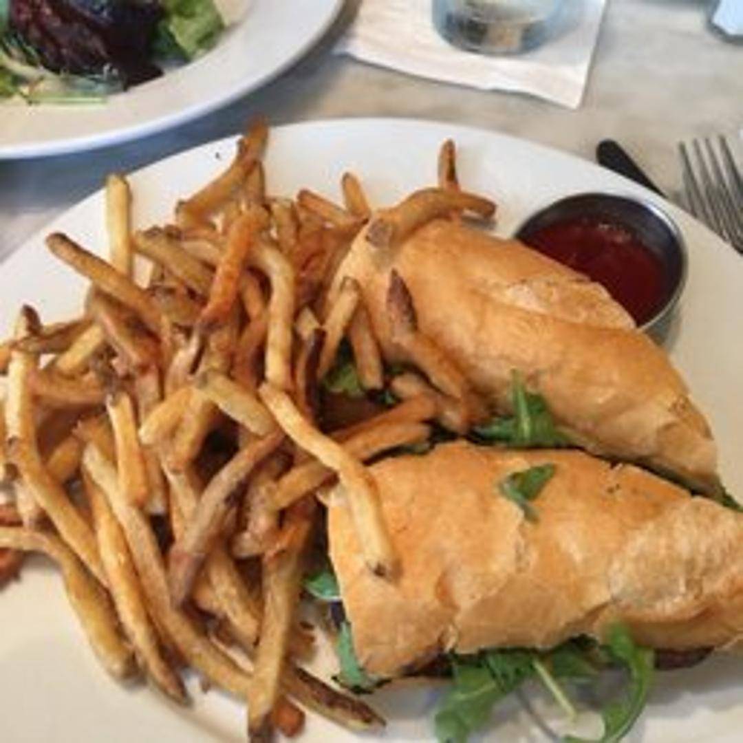 Grilled steak served on a toasted baguette with caramelized onions, Gruyère cheese, and a horseradish aioli. Accompanied by a side of mixed greens.