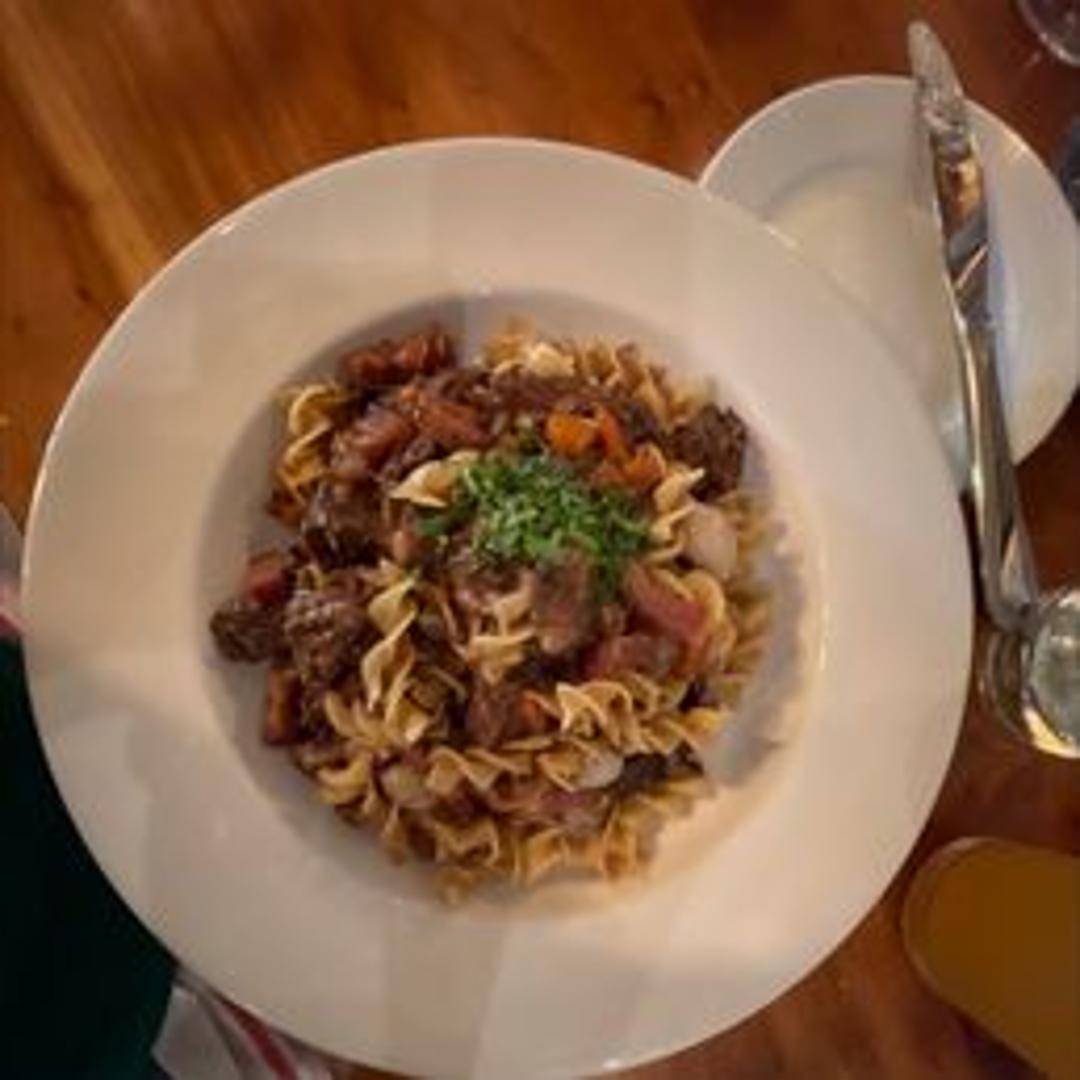 Tender, slow-braised beef in a red wine sauce with mushrooms, pearl onions, and bacon. Served with mashed potatoes or buttered noodles.