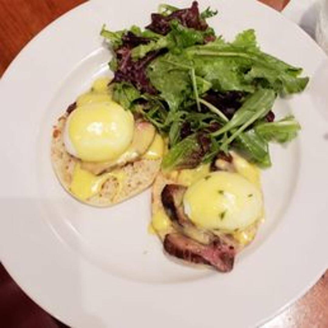 Toasted English muffin topped with Canadian bacon, poached eggs, and classic hollandaise sauce. Served with a side of breakfast potatoes.