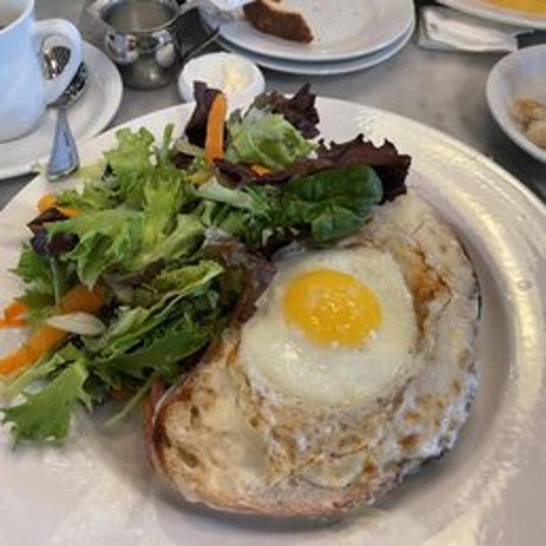 Grilled ham and Gruyère cheese sandwich dipped in béchamel sauce and topped with a fried egg. Served with a side salad.