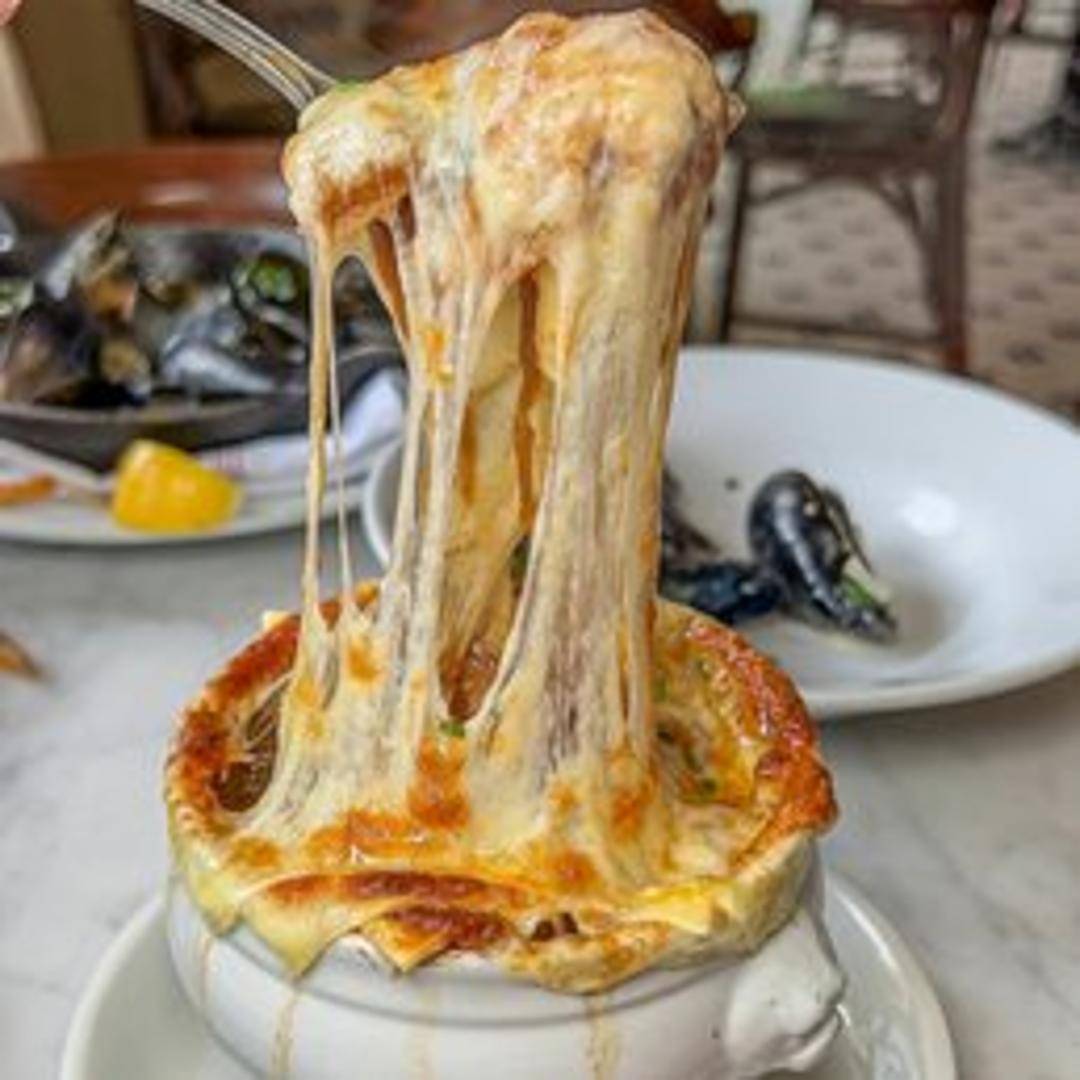 Classic French onion soup with a rich beef broth, caramelized onions, and a toasted baguette topped with melted Gruyère cheese.