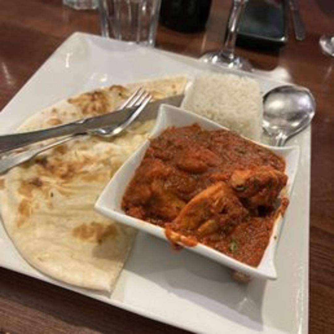 A fiery Goan curry featuring tender chicken pieces cooked in a tangy and spicy vindaloo sauce, made with vinegar, garlic, chilies, and a blend of aromatic spices.