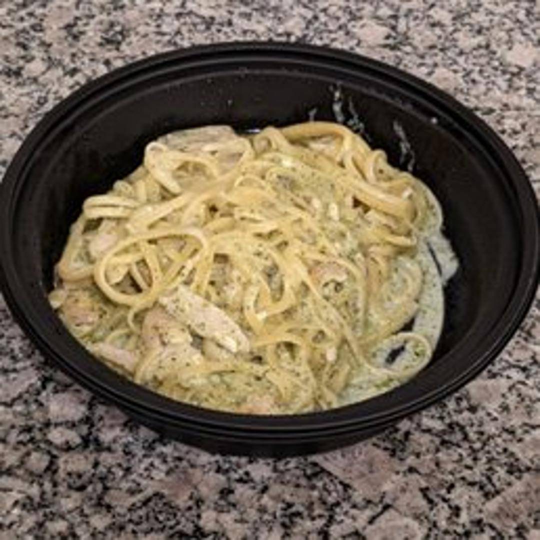 Cavatappi pasta tossed in a creamy pesto sauce with parmesan cheese and roasted tomatoes.
