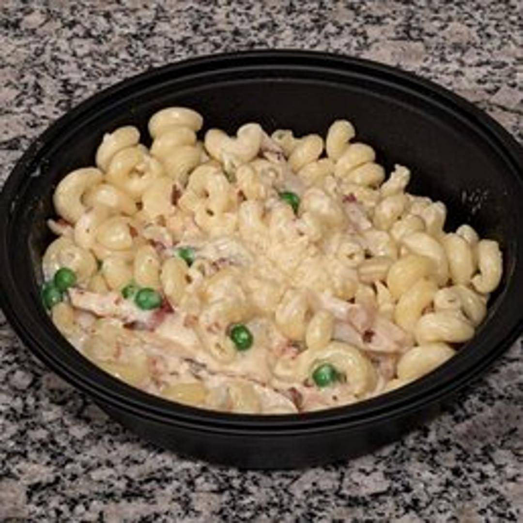 Cavatappi pasta tossed in a creamy carbonara sauce with grilled chicken, bacon, peas, and parmesan cheese.