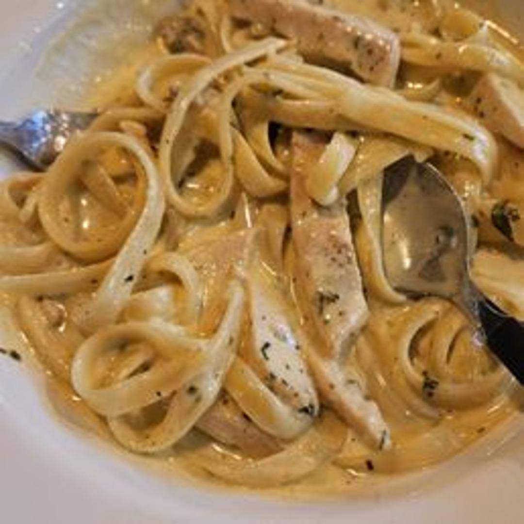 Grilled chicken breast tossed in a creamy Alfredo sauce with fettuccine pasta. Garnished with parmesan cheese and parsley.