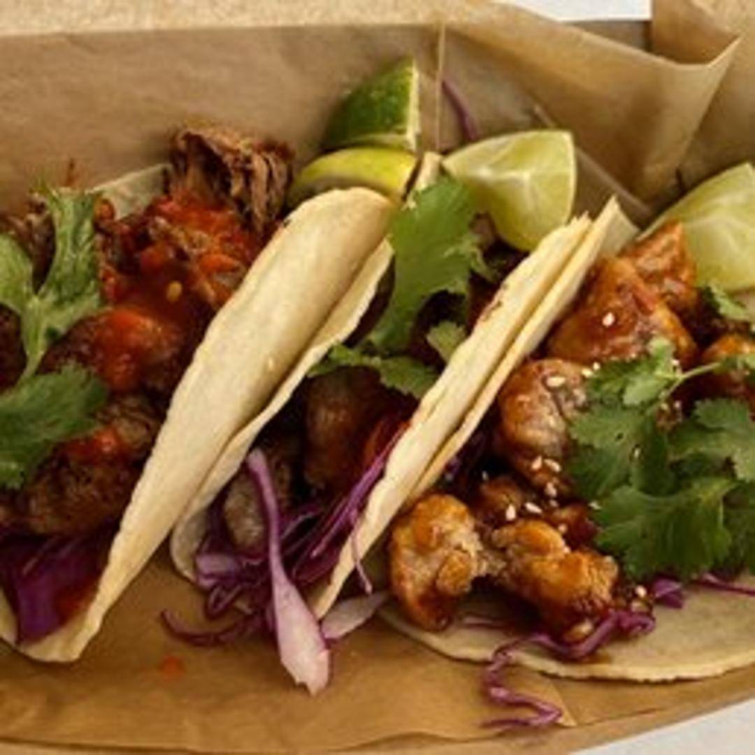 Grilled or shredded chicken served in a warm tortilla with your choice of toppings, including lettuce, tomato, cheese, salsa, sour cream, and guacamole.