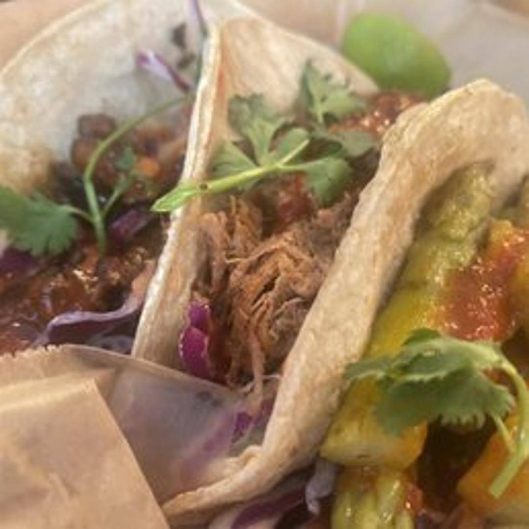Slow-cooked, tender brisket, shredded or cubed, served in a warm tortilla. Typically includes toppings like pickled onions, cilantro, and a flavorful sauce.