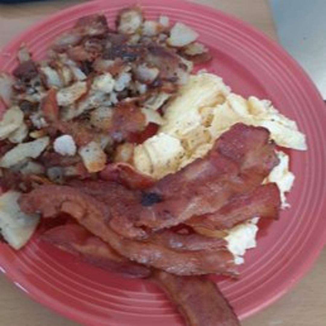 A hearty breakfast platter featuring a generous portion of bacon, sausage, ham, eggs (prepared to your liking), and your choice of pancakes, toast, or biscuits. Fuel up for the day with this substantial meal.
