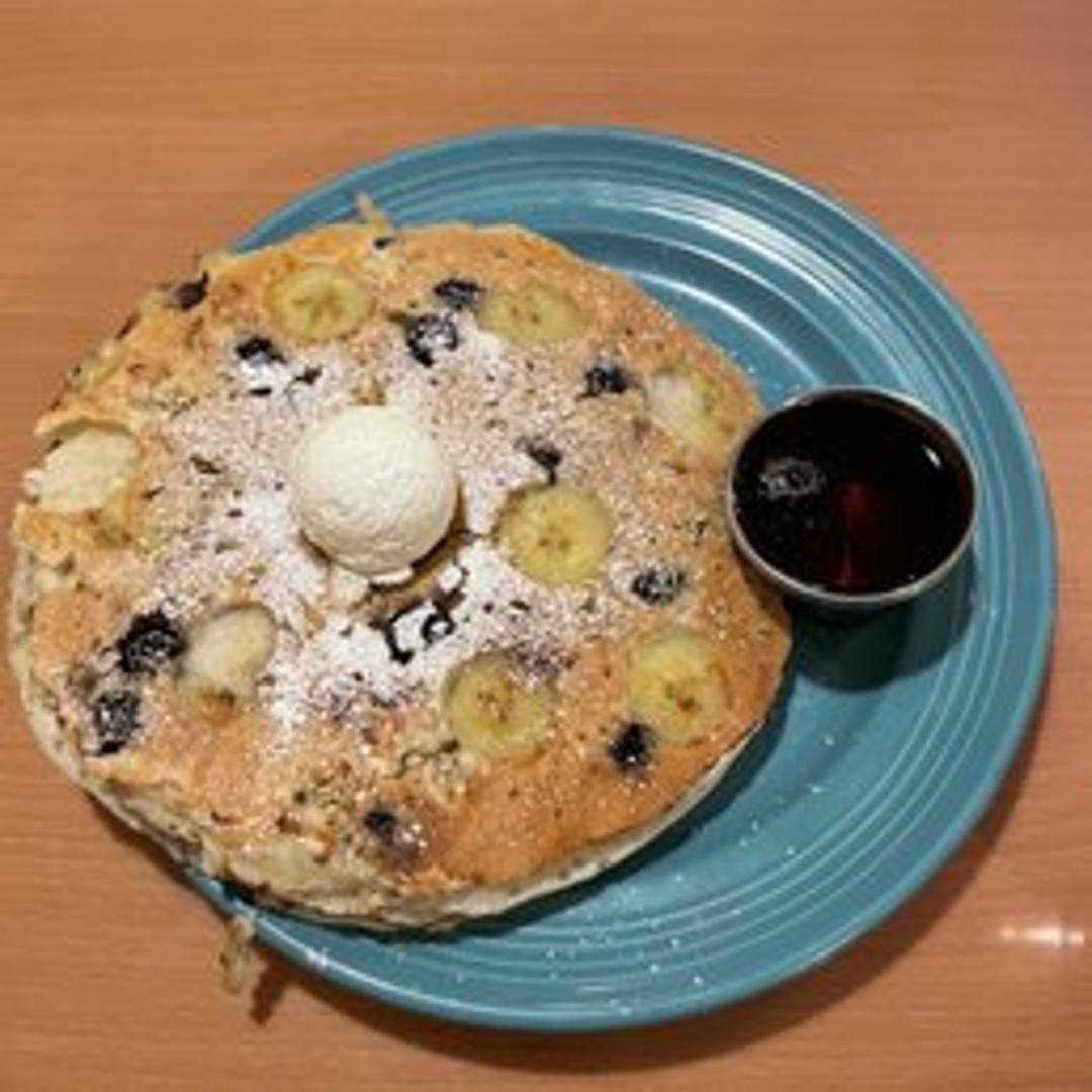 Two fluffy pancakes packed with crunchy granola, served with butter and syrup.