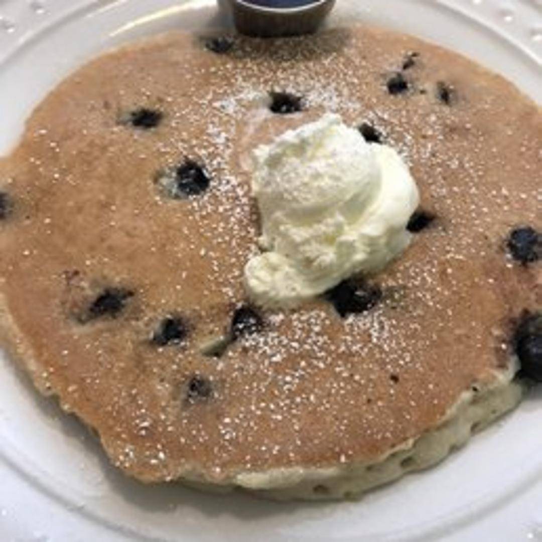 Two fluffy pancakes studded with juicy blueberries, served with butter and syrup.