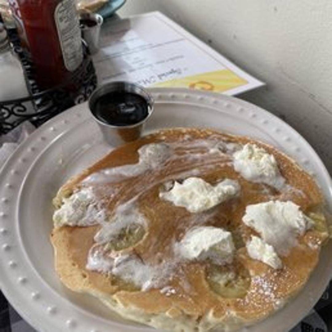 Two fluffy pancakes filled with slices of banana, served with butter and syrup.