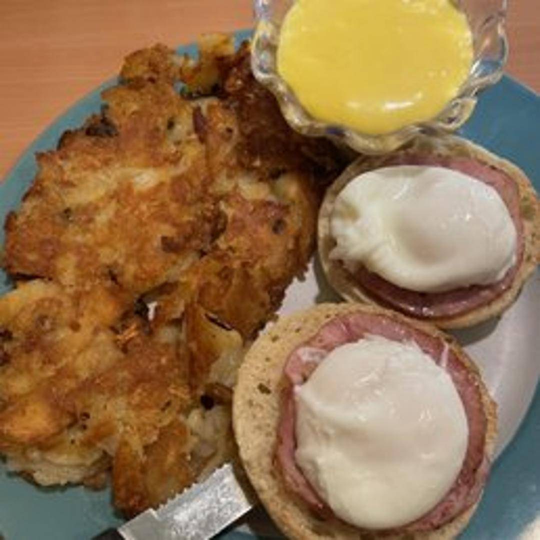 Toasted English muffins topped with Canadian bacon, poached eggs, and creamy hollandaise sauce. A decadent and satisfying breakfast.
