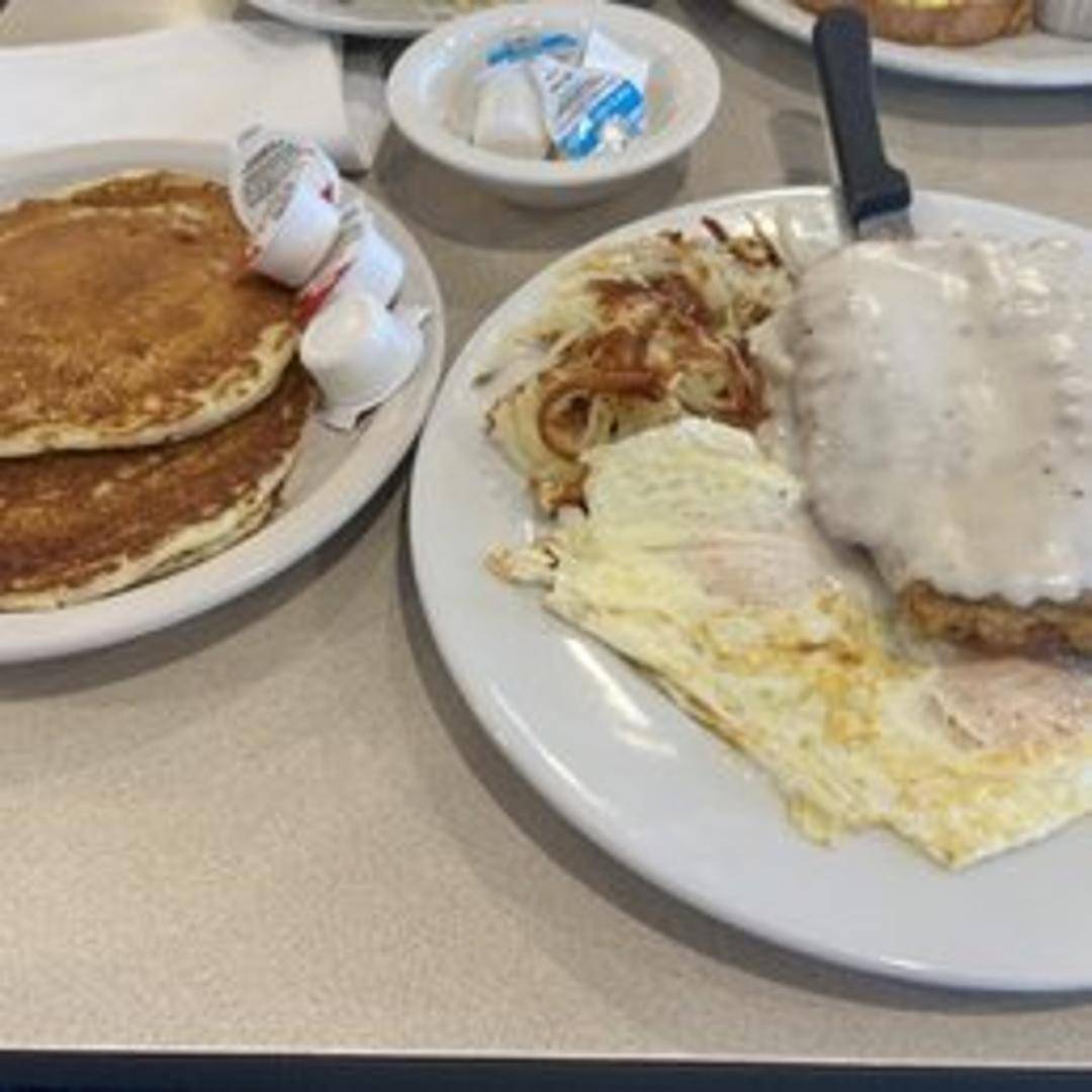 A tender, breaded steak, deep-fried and smothered in creamy country gravy. Served with two eggs cooked to order and your choice of breakfast potatoes and toast or pancakes.
