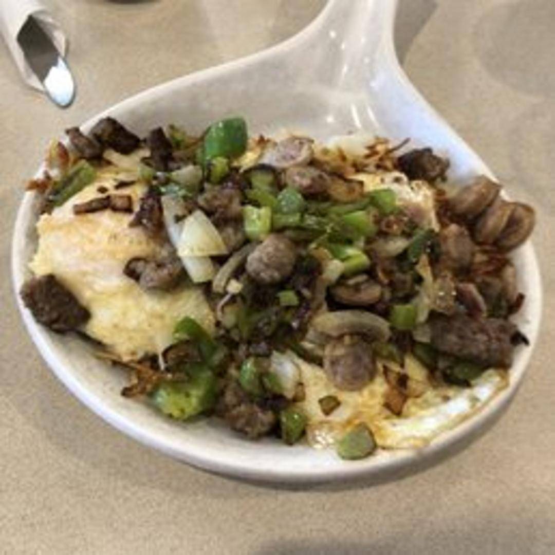 A hearty skillet piled high with scrambled eggs, diced ham, sausage, bacon, onions, peppers, and melted cheese. Served with your choice of toast or pancakes.
