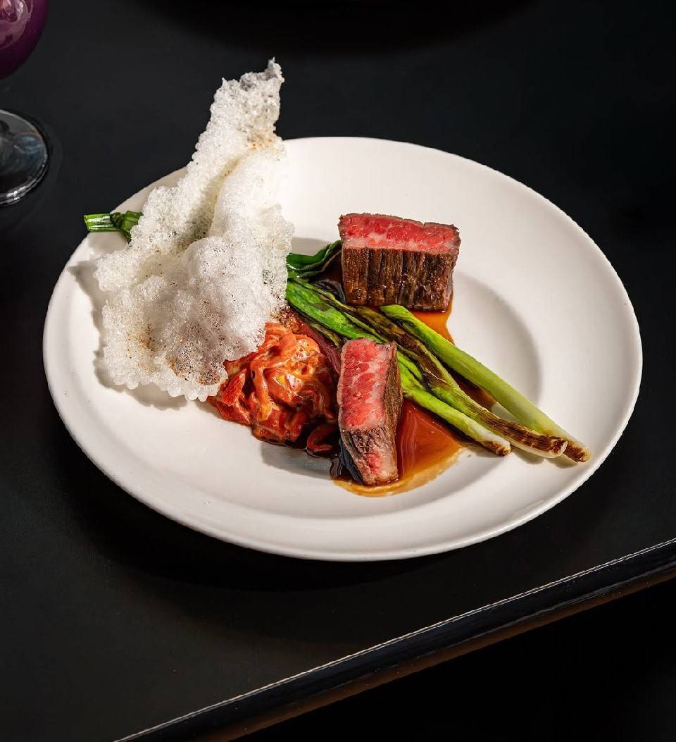 Wagyu Flank, served with smoked piquillo pepper sauce, sansho pepper kimizu, veal jus, and garlic chip.
