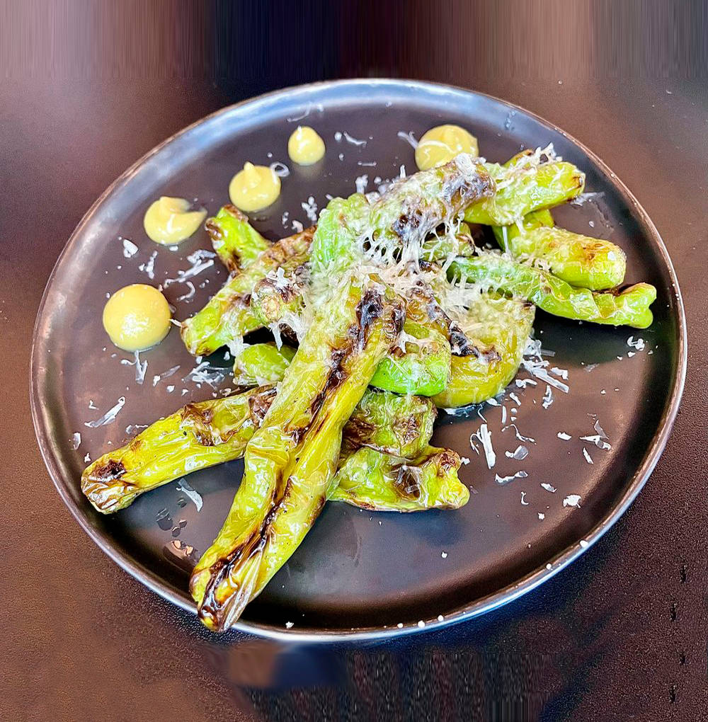Delight in a plate of perfectly blistered Shishito peppers, known for their mild and occasionally surprising kick. These vibrant green peppers are simply prepared to highlight their fresh, slightly sweet flavor, making for an addictive and flavorful snack or side.