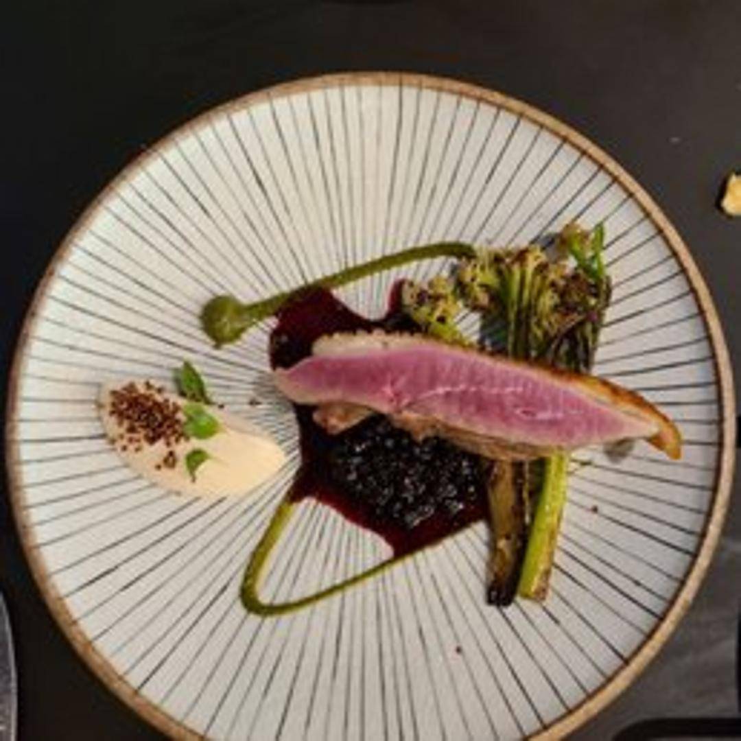 Delicately smoked duck breast, thinly sliced to showcase its tender texture and a harmonious balance of savory, smoky notes. Prepared to highlight the duck's natural richness, offering a refined and aromatic experience.