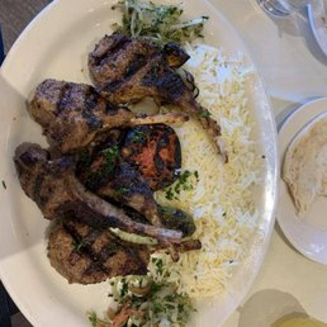 Grilled lamb chops seasoned with Mediterranean spices, served with rice and grilled vegetables.