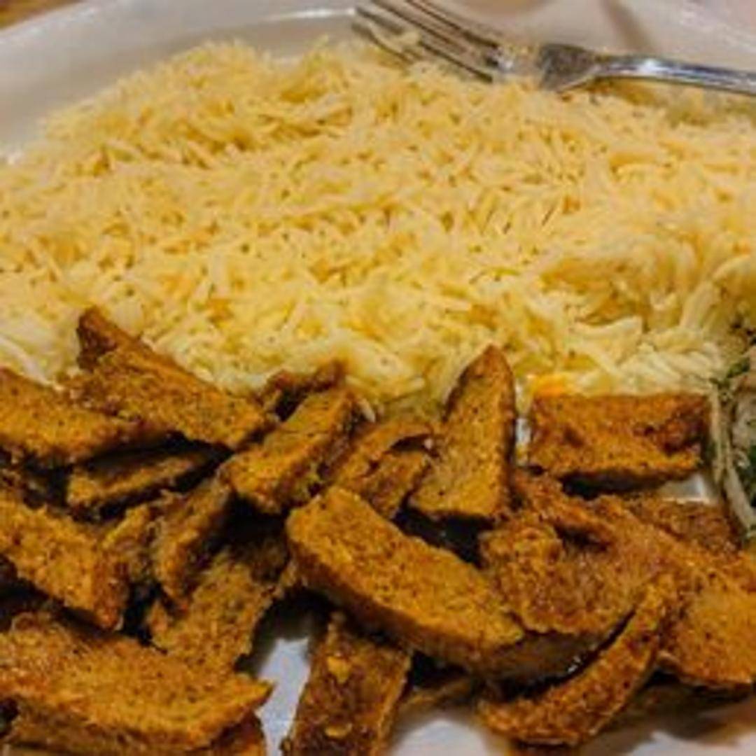 Thinly sliced seasoned meat (typically lamb and beef), cooked on a vertical spit and served in a pita bread with tzatziki sauce, lettuce, tomatoes, and onions.