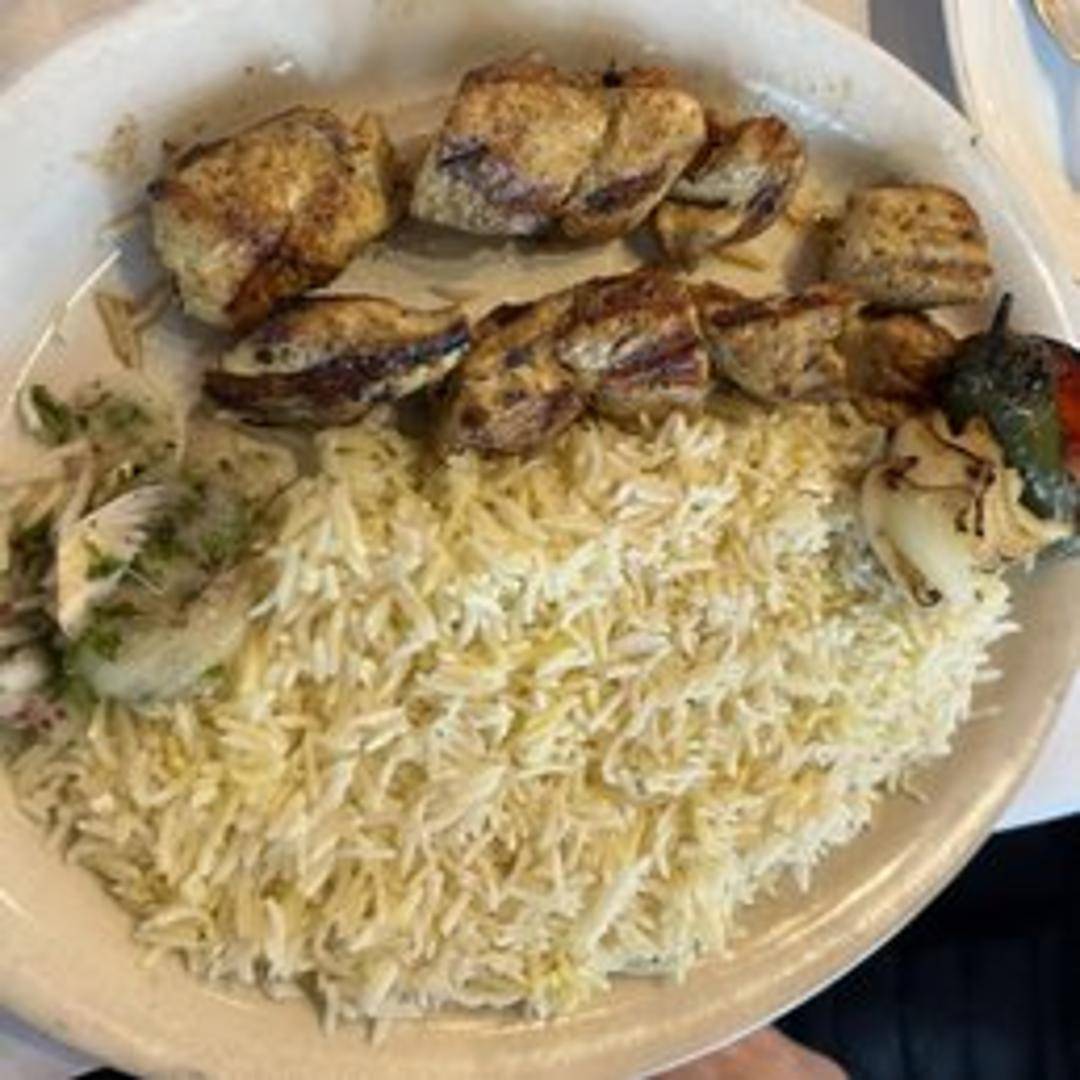 Juicy marinated chicken cubes grilled to perfection. Served on a skewer with rice and grilled vegetables.