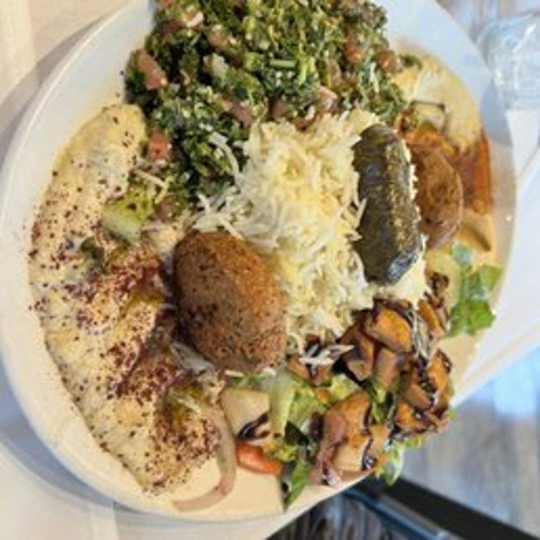A combination of vegetarian options, served with hummus, baba ghanoush, falafel, dolma, rice, and pita bread.