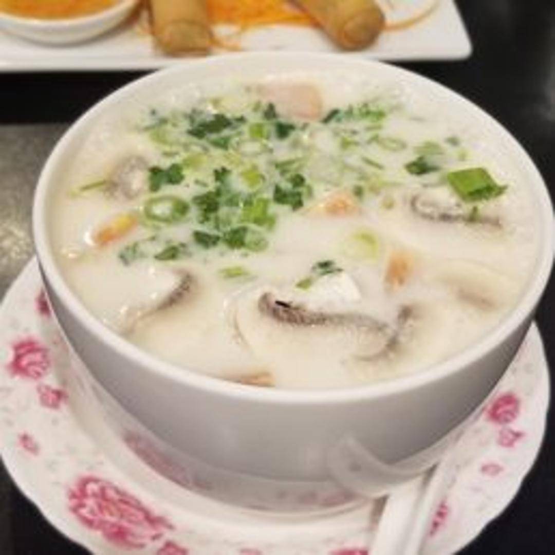 A creamy and aromatic coconut milk soup, renowned for its delicate balance of sweet, sour, and savory notes. Infused with traditional Thai herbs like galangal, lemongrass, and kaffir lime leaves, this comforting soup typically includes tender slices of chicken or mushrooms, finished with a squeeze of fresh lime juice and a sprinkle of cilantro.