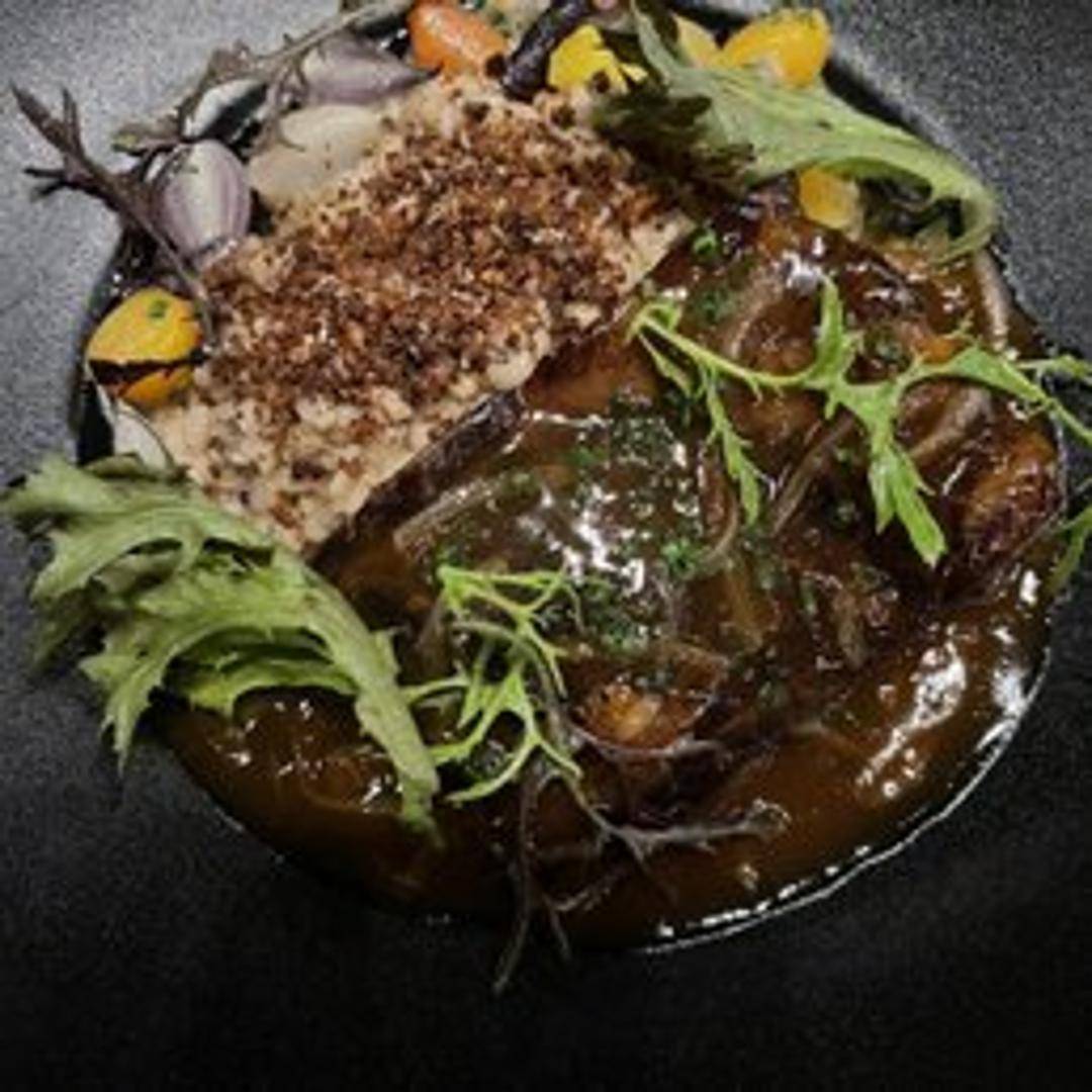 Slow-braised beef short rib, celebrated for its fork-tender texture and intensely rich, savory flavor. Cooked until it effortlessly falls from the bone, it's often served with a luscious reduction sauce, making it a truly decadent and comforting main course.