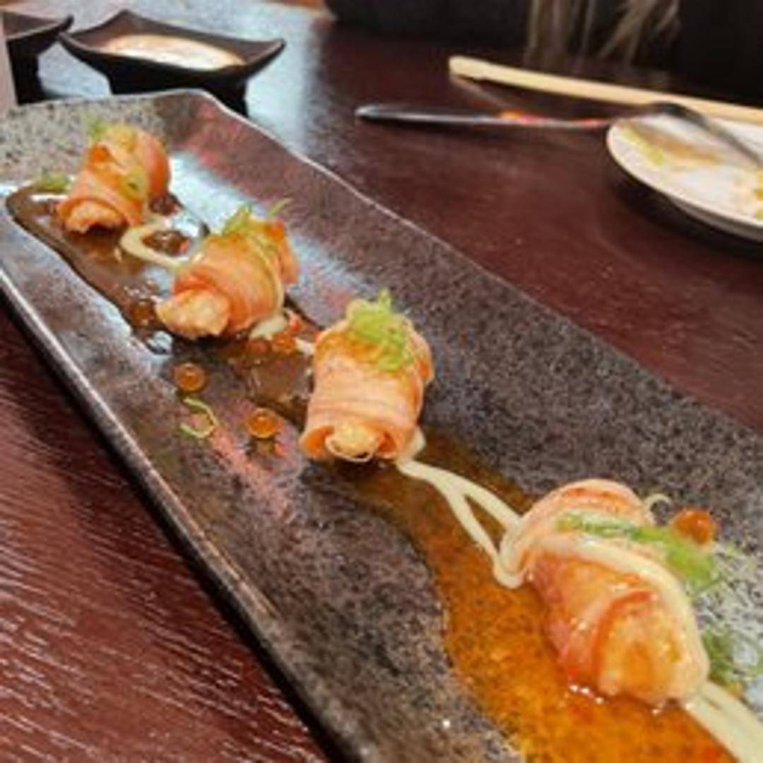 Salmon, avocado, and cream cheese roll topped with smoked salmon and tobiko.